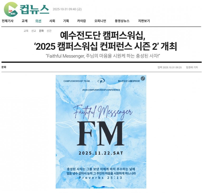 뮤직타임 [기사] 예수전도단 캠퍼스워십, ‘2025 캠퍼스워십 컨퍼런스 시즌 2’ 개최(크리스챤연합신문 컵뉴스)