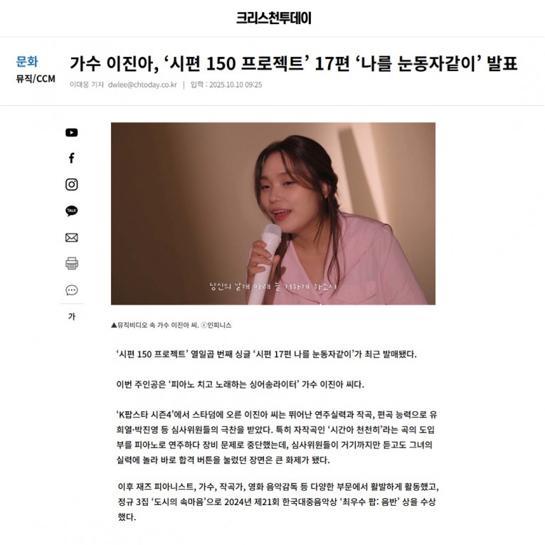 뮤직타임 [기사] 가수 이진아, ‘시편 150 프로젝트’ 17편 ‘나를 눈동자같이’ 발표(크리스천투데이)